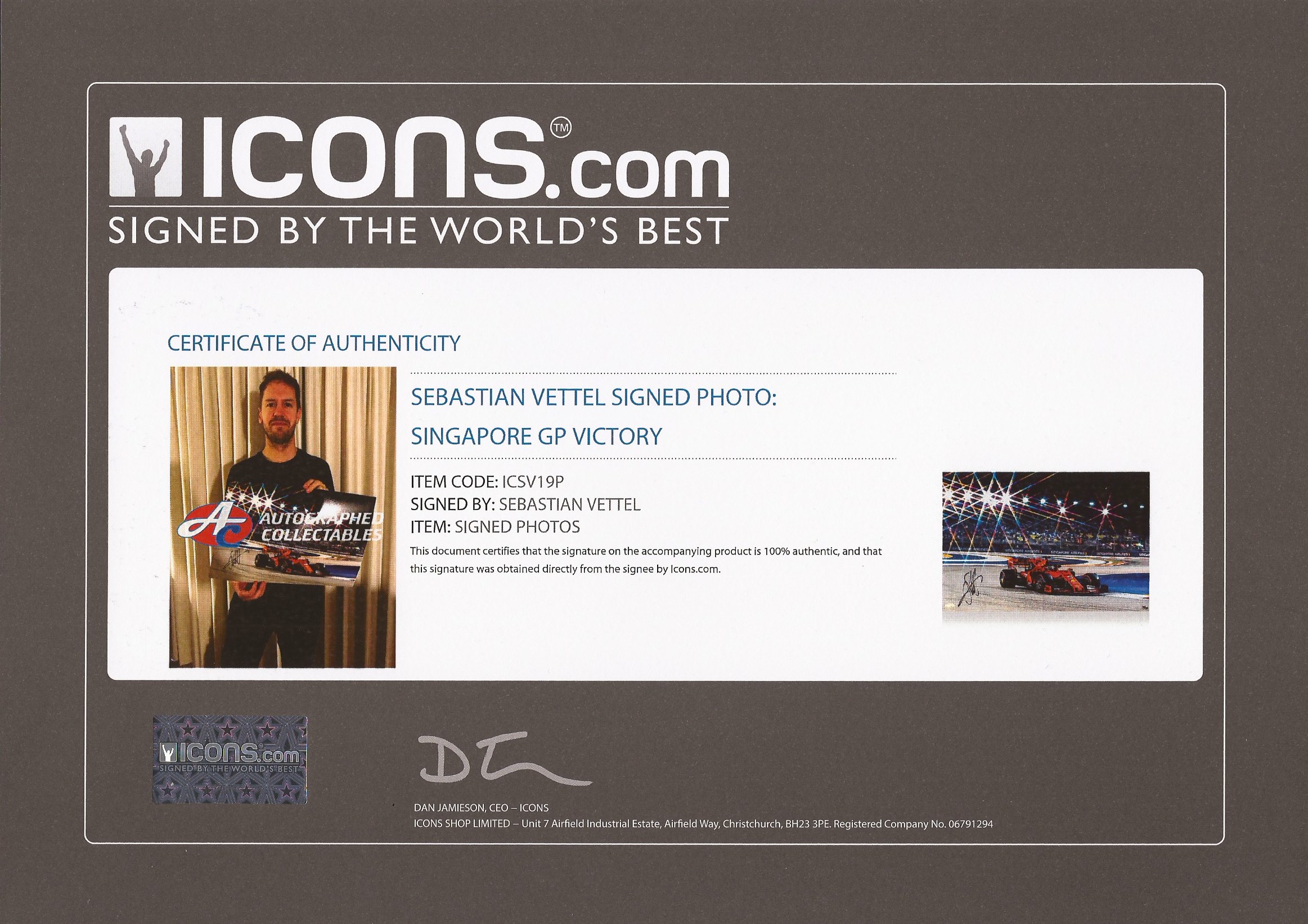 Stand on top of the podium with this signed and numbered Sebastian Vettel Ferrari F1 photo from his victory at the Singapore Grand Prix in 2019.